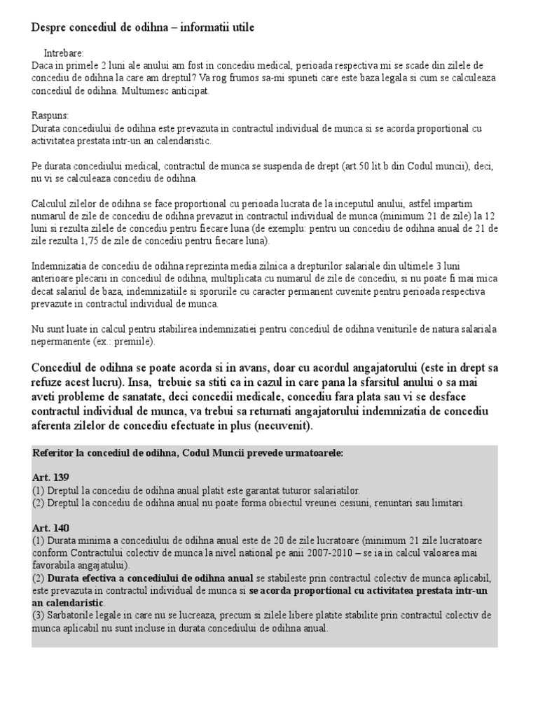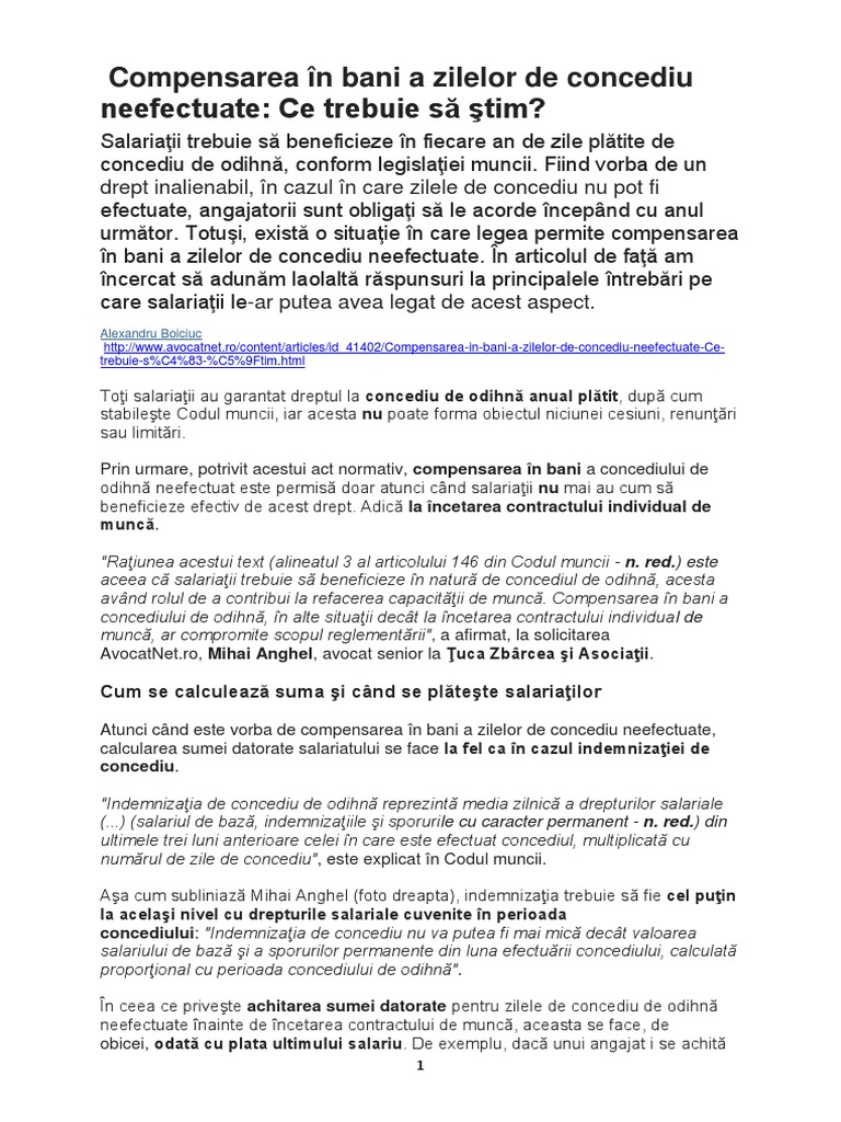 vizitati articolul complet aici : 6 days ago Va oferim un ghid cu informatii complete si 100% actuale despre. (3) compensarea în bani a concediului de odihnă neefectuat este permisă numai în cazul încetării contractului individual de muncă. Indemnizatia de concediu cuvenita pentru perioada concediului de odihna se determina conform art.